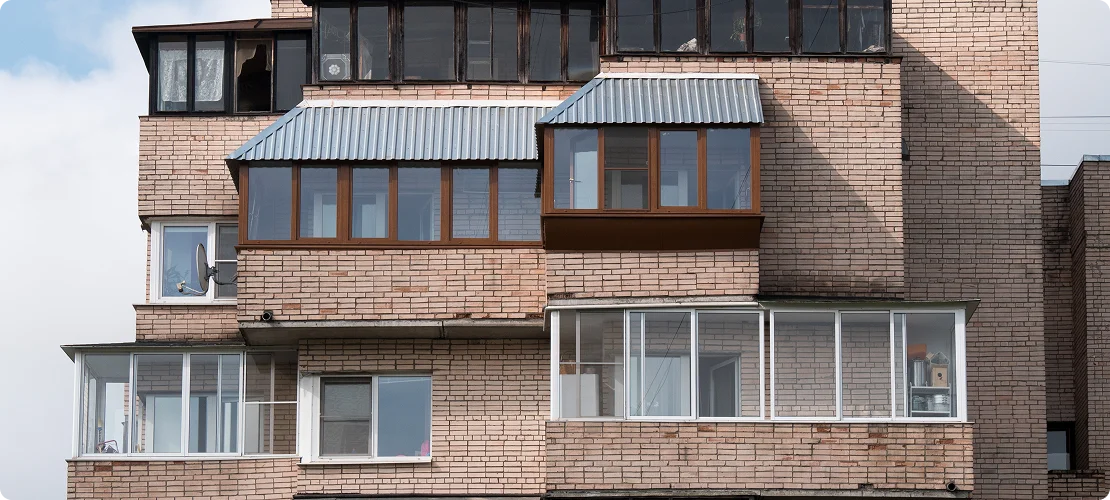 При остеклении нужно выбирать материалы, которые по цвету и текстуре соответствуют оригинальным и не выделяются на фоне других балконов дома. Часто эти действия напрямую запрещены также договорами с УК и постановлениями местных органов.