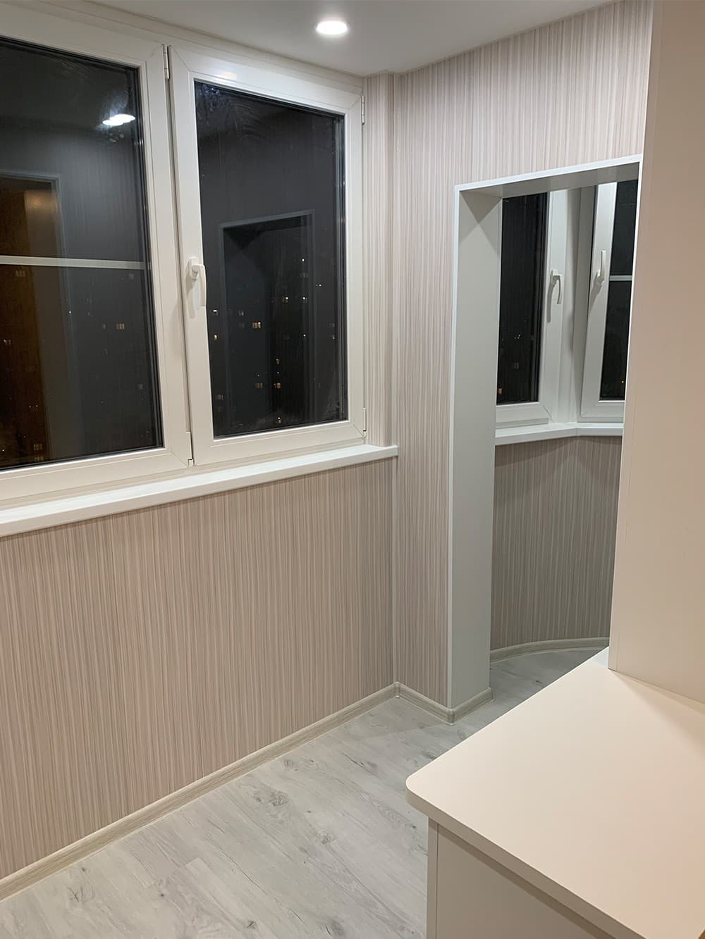 Выполненные работы: Остекление лоджии профилем REHAU Grazio, Утепление и отделка ламинированными панелями, Проводка электрики и установка светильников, Вывоз мусора